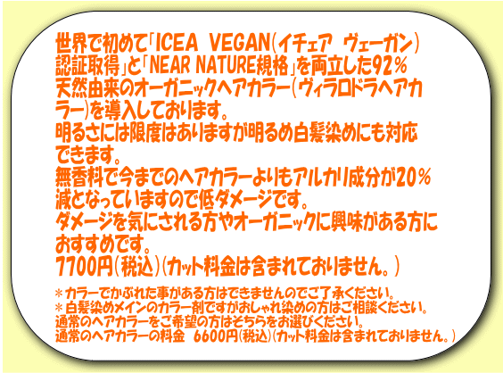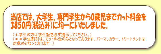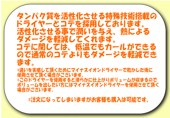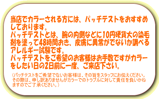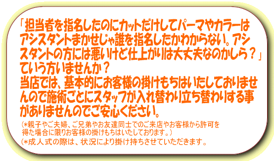 ![]() 予約に関してですが、当店はお店も小さいですし少ない人数で営業しております。 そのため、施術ごとにスタッフが入れ替わり立ち替わりすることはありませんし、 できるだけお待たせしない営業体制をしておりますのでお手数ではありますがご 予約のほどをよろしくお願いします。<(_ _)> 男性スタイリストの江場ですと、事前予約ができますが、女性スタイリストの荒井は、 子供が小さいため子供の体調によってお店に出れないことがありますので、荒井の 予約に関しては、当日予約で対応させていただいております。<(_ _)> 荒井に予約をする場合は下記の注意事項をお読みください。 □ 荒井の予約に関しての注意事項 □ ・まだ子供が小さいですので子供の体調が悪くなることもありますので、荒井の予約 に関しては、当日予約とさせていただきます。 ・受付開始時刻は、朝8時からとさせていただきます。 ・朝8時より前のお電話は、受け付けておりませんのでご了承ください。 (数秒、早くても受け付けておりませんのでご了承ください。) ・荒井のメールでの予約は受け付けておりません。 ・朝8時の電話は混み合って繋がりにくい場合があると思いますがご了承ください。 ・江場に予約を入れていた場合から荒井へ予約を変更する場合は、予約日の前日 までの変更は大丈夫ですが当日の変更はご遠慮ください。<(_ _)> ・荒井のお店にでれる時間は、月曜日~土曜日、10時~17時までとなっております。 ・荒井のお休みは、毎週日曜日、毎週火曜日、第三水曜日と祝日となります。 お客様には、大変、ご迷惑お掛けいたしますがご理解のほどよろしくお願いします。 また、予約されないでご来店された場合、その後の予約のお客さまに影響がでる と判断した場合や店の混雑具合によっては長い時間お待ちいただくことが心苦し いのでお断りさせていただくか、予約を入れなおしていただくことになりますの でご了承ください。 なお、この仕事、手作業で行う仕事ですし、薬の反応も人それぞれ違いますので 時間が読めないところがございます。そのため、時間が押して予約をしていただ いてもお待ちになる場合がございますのであらかじめご了承ください。 予約は、電話とご希望の来店日より3日前まででしたらメールでも承っております。 メールでのご予約に関してですが、当店を初めてご利用されるお客様は、 ・お名前 ・電話番号(メールでの返信ができない場合、電話にてご連絡させて頂きます。) ・施術されるメニュー (カット、カラー、パーマ、まつげカールなど。トリートメントをご希望の方は トリートメントコースをお選びください。料金表を参考にしてください。) ・希望日時(第三希望まで書いていただけるとありがたいです。) ・紹介者の有無(紹介者がいる場合は、紹介者のお名前) ・学生 or 65歳以上 or それら以外かどうかを記入 を記入のうえ、送信くださいますようお願い申し上げます。 キャンセル待ちをご希望のお客様は、その旨をお伝えください。 キャンセルが出た場合、電話にてご連絡いたします。 ![]() 当店は、完全予約制で営業しておりますので予約を頂いた後は、そのお時間は 他のお客様をお断りしている状態になっておりますので、予約をキャンセルする場 合は、お早めにご連絡をお願いします。<(_ _)> お早目にご連絡を頂ければキャンセル待ちのお客様にご連絡をすることができま すがキャンセルのご連絡がない場合やご予約時間ギリギリのキャンセルですと大 変、困ってしまいます。(>_<) 急なお仕事や用事、体調不良などは生活をしているとあるのは当然だとは思いま すができるだけお早目のご連絡をいただけると大変、助かります。 予約したメニューを変更する場合もお早目にご連絡ください。<(_ _)> 何卒、ご協力をお願いします。<(_ _)> 定休日や営業時間外の場合でもご連絡ください。 電話がつながらない場合は、メールや留守番電話でお知らせください。 よろしくお願いします。<(_ _)> ![]() ![]() ![]() 少しは当店の事がわかっていただきましたか? 私たちのお店の料金はけっして安いお店ではありません。 ○○キャンペーンなど常に割引をして本当の価格が曖昧なお店でもありません。 なぜ、そのようなことをしないかと言いますと理由が2つあります。 1つは、技術に自信がないと思われたくないからです。 確かに私たちは神様ではありませんので100人の人、全員を満足して頂く自信は ありません。 ですが、常に技術向上を目指しております。 もう1つの理由は、今までにご来店されて通常料金を払って下さったお客様に申し 訳ないからです。確かに○○キャンペーンなどいつも割引をすればたくさんの新 しいお客様が来られるかもしれません。 ですが、私たちのお店では、当店をご利用して下さったお客様が少しでも不快に 思うことはしたくはないからです。 そして、私たちスタッフはこの美容という仕事が好きです。この仕事に誇りを持っ てます。 そして人が好きで