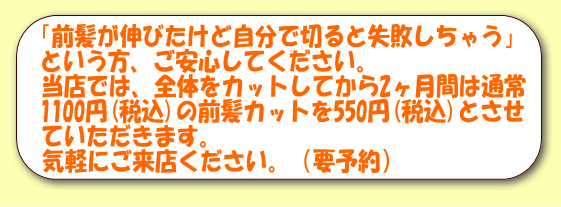![]() 予約に関してですが、当店はお店も小さいですし少ない人数で営業しております。 そのため、施術ごとにスタッフが入れ替わり立ち替わりすることはありませんし、 できるだけお待たせしない営業体制をしておりますのでお手数ではありますがご 予約のほどをよろしくお願いします。<(_ _)> 男性スタイリストの江場ですと、事前予約ができますが、女性スタイリストの荒井は、 子供が小さいため子供の体調によってお店に出れないことがありますので、荒井の 予約に関しては、当日予約で対応させていただいております。<(_ _)> 荒井に予約をする場合は下記の注意事項をお読みください。 □ 荒井の予約に関しての注意事項 □ ・まだ子供が小さいですので子供の体調が悪くなることもありますので、荒井の予約 に関しては、当日予約とさせていただきます。 ・受付開始時刻は、朝8時からとさせていただきます。 ・朝8時より前のお電話は、受け付けておりませんのでご了承ください。 (数秒、早くても受け付けておりませんのでご了承ください。) ・荒井のメールでの予約は受け付けておりません。 ・朝8時の電話は混み合って繋がりにくい場合があると思いますがご了承ください。 ・江場に予約を入れていた場合から荒井へ予約を変更する場合は、予約日の前日 までの変更は大丈夫ですが当日の変更はご遠慮ください。<(_ _)> ・荒井のお店にでれる時間は、月曜日~土曜日、10時~17時までとなっております。 ・荒井のお休みは、毎週日曜日、毎週火曜日、第三水曜日と祝日となります。 お客様には、大変、ご迷惑お掛けいたしますがご理解のほどよろしくお願いします。 また、予約されないでご来店された場合、その後の予約のお客さまに影響がでる と判断した場合や店の混雑具合によっては長い時間お待ちいただくことが心苦し いのでお断りさせていただくか、予約を入れなおしていただくことになりますの でご了承ください。 なお、この仕事、手作業で行う仕事ですし、薬の反応も人それぞれ違いますので 時間が読めないところがございます。そのため、時間が押して予約をしていただ いてもお待ちになる場合がございますのであらかじめご了承ください。 予約は、電話とご希望の来店日より3日前まででしたらメールでも承っております。 メールでのご予約に関してですが、当店を初めてご利用されるお客様は、 ・お名前 ・電話番号(メールでの返信ができない場合、電話にてご連絡させて頂きます。) ・施術されるメニュー (カット、カラー、パーマ、まつげカールなど。トリートメントをご希望の方は トリートメントコースをお選びください。料金表を参考にしてください。) ・希望日時(第三希望まで書いていただけるとありがたいです。) ・紹介者の有無(紹介者がいる場合は、紹介者のお名前) ・学生 or 65歳以上 or それら以外かどうかを記入 を記入のうえ、送信くださいますようお願い申し上げます。 キャンセル待ちをご希望のお客様は、その旨をお伝えください。 キャンセルが出た場合、電話にてご連絡いたします。 ![]() 当店は、完全予約制で営業しておりますので予約を頂いた後は、そのお時間は 他のお客様をお断りしている状態になっておりますので、予約をキャンセルする場 合は、お早めにご連絡をお願いします。<(_ _)> お早目にご連絡を頂ければキャンセル待ちのお客様にご連絡をすることができま すがキャンセルのご連絡がない場合やご予約時間ギリギリのキャンセルですと大 変、困ってしまいます。(>_<) 急なお仕事や用事、体調不良などは生活をしているとあるのは当然だとは思いま すができるだけお早目のご連絡をいただけると大変、助かります。 予約したメニューを変更する場合もお早目にご連絡ください。<(_ _)> 何卒、ご協力をお願いします。<(_ _)> 定休日や営業時間外の場合でもご連絡ください。 電話がつながらない場合は、メールや留守番電話でお知らせください。 よろしくお願いします。<(_ _)> ![]() ![]() ![]() 少しは当店の事がわかっていただきましたか? 私たちのお店の料金はけっして安いお店ではありません。 ○○キャンペーンなど常に割引をして本当の価格が曖昧なお店でもありません。 なぜ、そのようなことをしないかと言いますと理由が2つあります。 1つは、技術に自信がないと思われたくないからです。 確かに私たちは神様ではありませんので100人の人、全員を満足して頂く自信は ありません。 ですが、常に技術向上を目指しております。 もう1つの理由は、今までにご来店されて通常料金を払って下さったお客様に申し 訳ないからです。確かに○○キャンペーンなどいつも割引をすればたくさんの新 しいお客様が来られるかもしれません。 ですが、私たちのお店では、当店をご利用して下さったお客様が少しでも不快に 思うことはしたくはないからです。 そして、私たちスタッフはこの美容という仕事が好きです。この仕事に誇りを持っ てます。 そして人が好きで